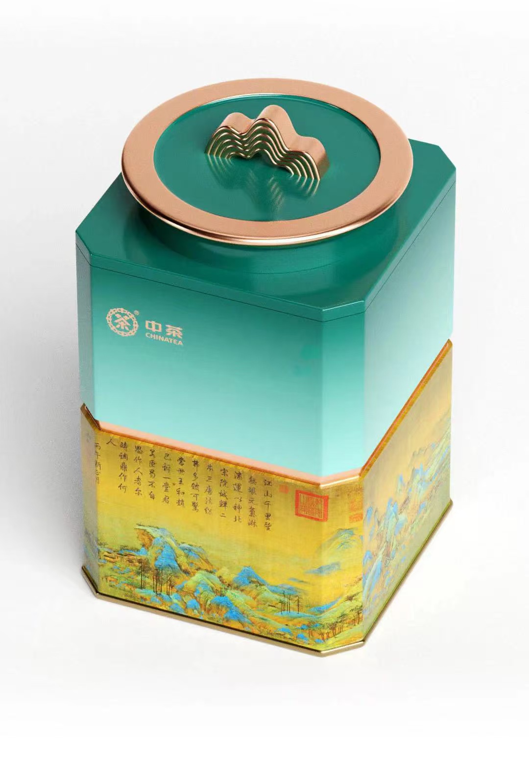 “中茶千山系列”以独特创意与高辨识度设计著称,其包装设计灵感源自北宋画家王希孟传世名作《千里江山图》,从色彩与图形上进行了细致雕琢,实现了传统文化与当代审美的巧妙融合。